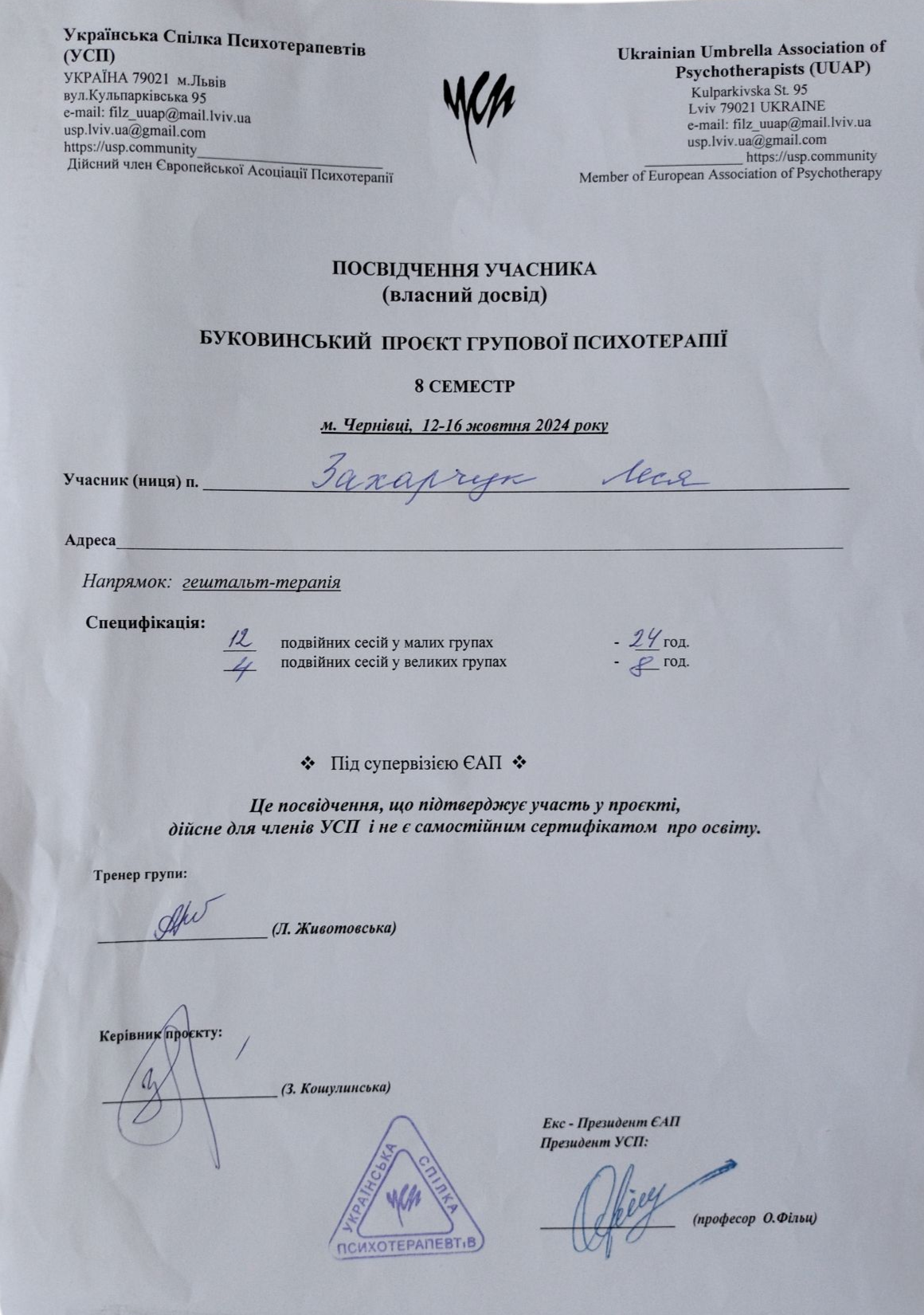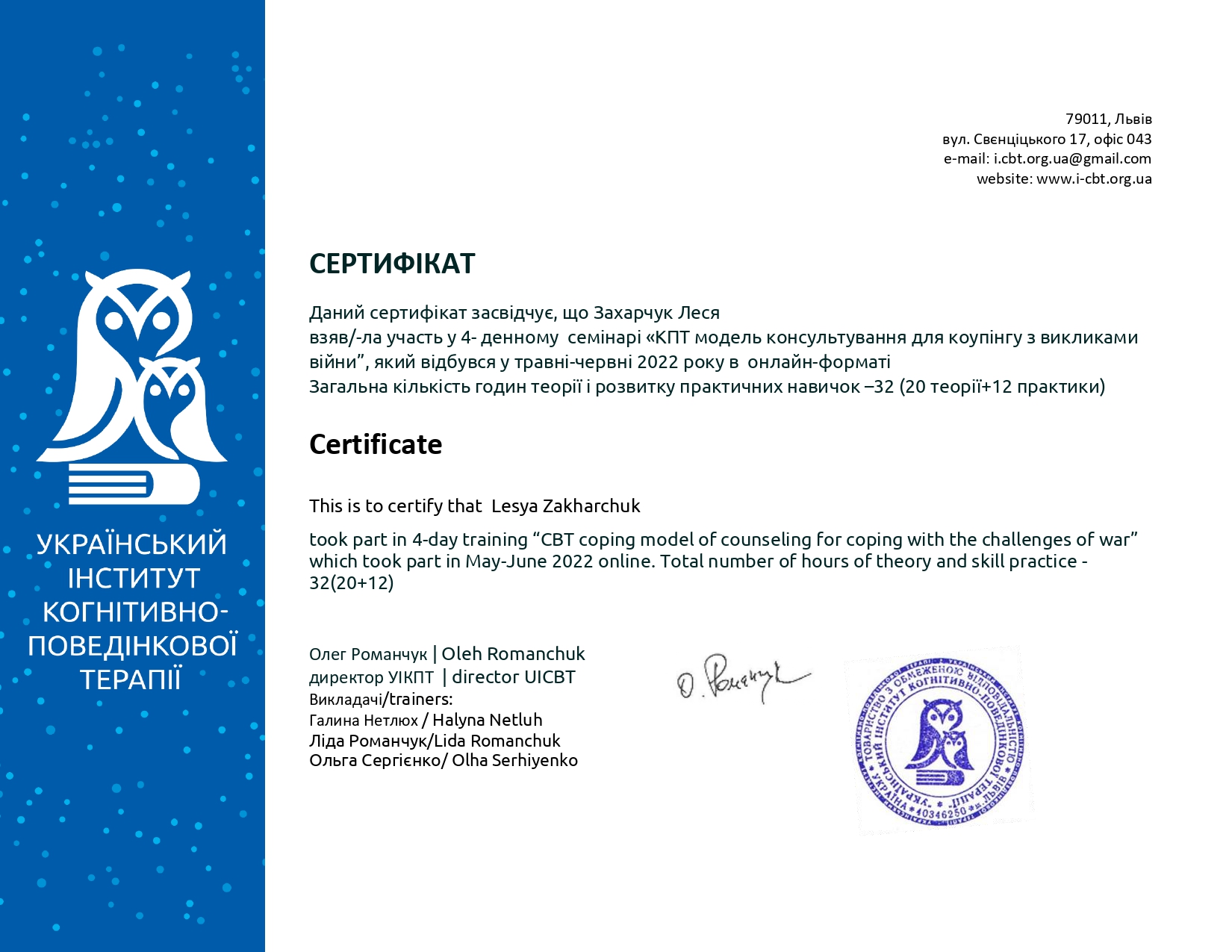 2022 р. – Український інститут когнітивно-поведінкової терапії. Участь у 4- денному сертифікованому