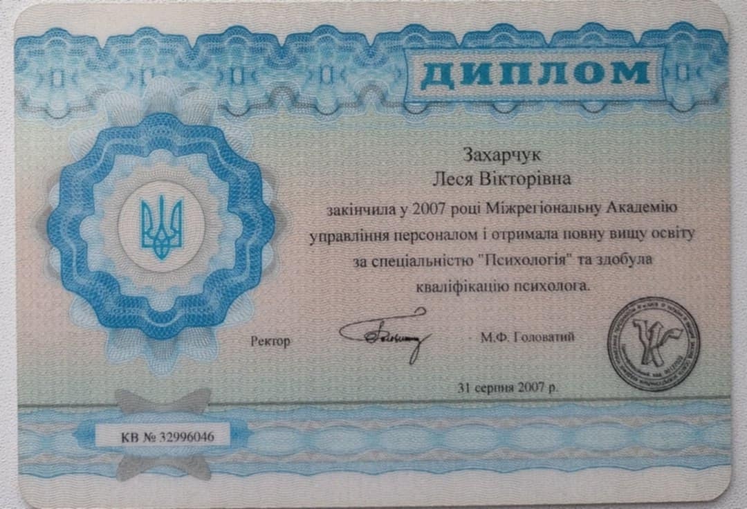 2007 р. – Міжрегіональна Академія управління персоналом, спеціальність-психологія, кваліфікація спеціаліст;