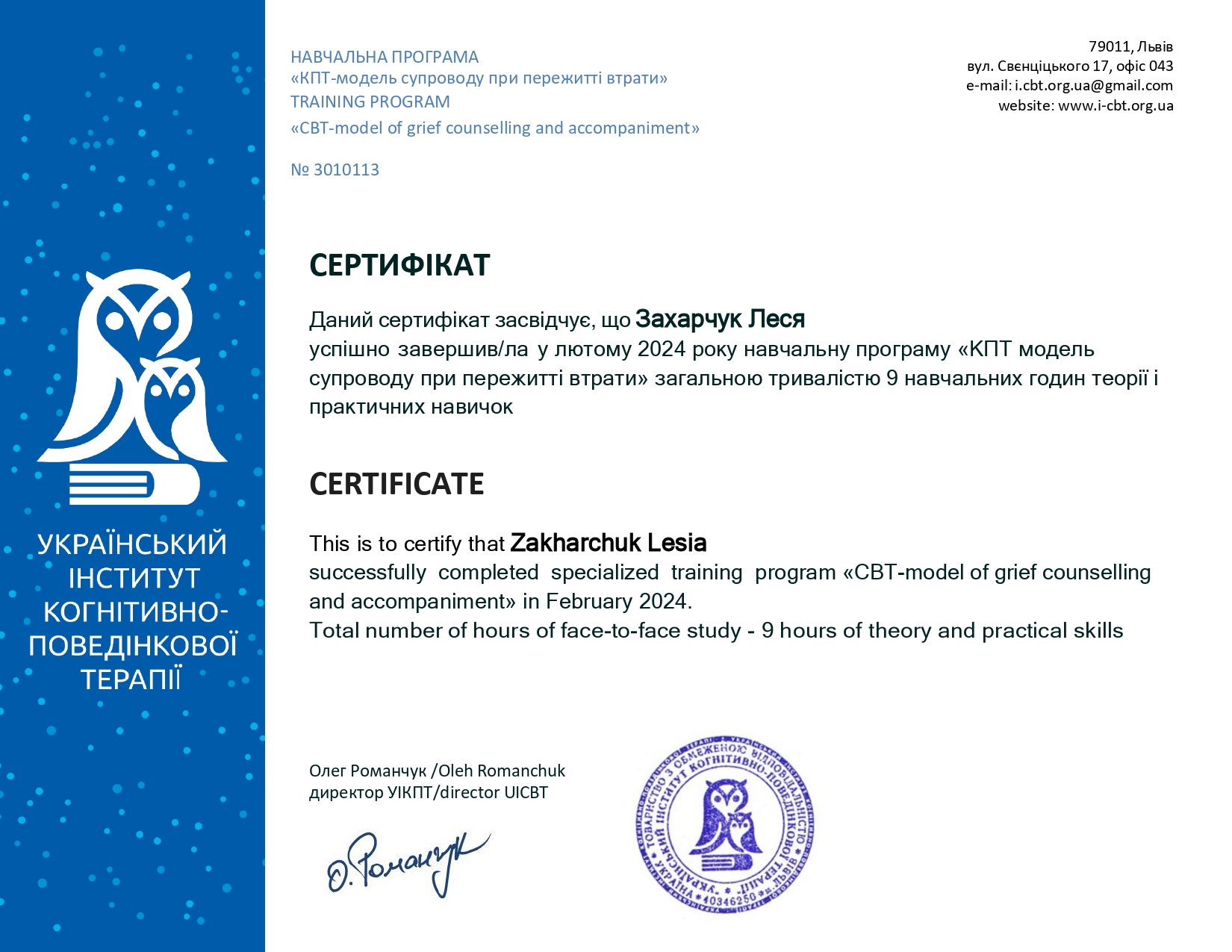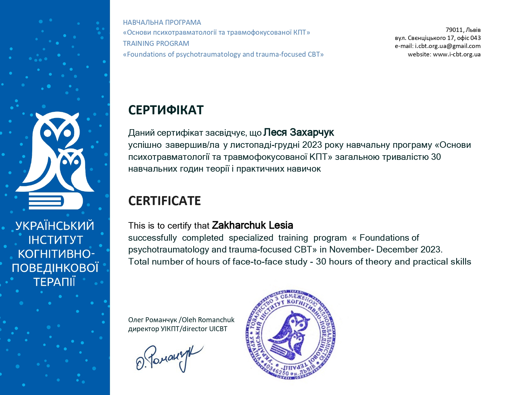 2023 р. – Український інститут когнітивно-поведінкової терапії. Навчальна програма «Основи психотравматології та травмафокусованої КПТ»;