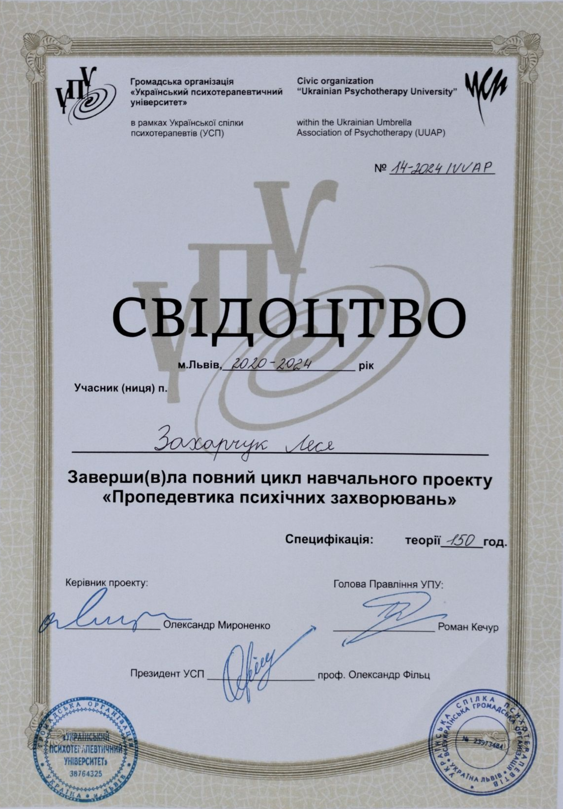 2021-2024 р. – Навчання в УПУ на курсі Пропедевтика психіатрії