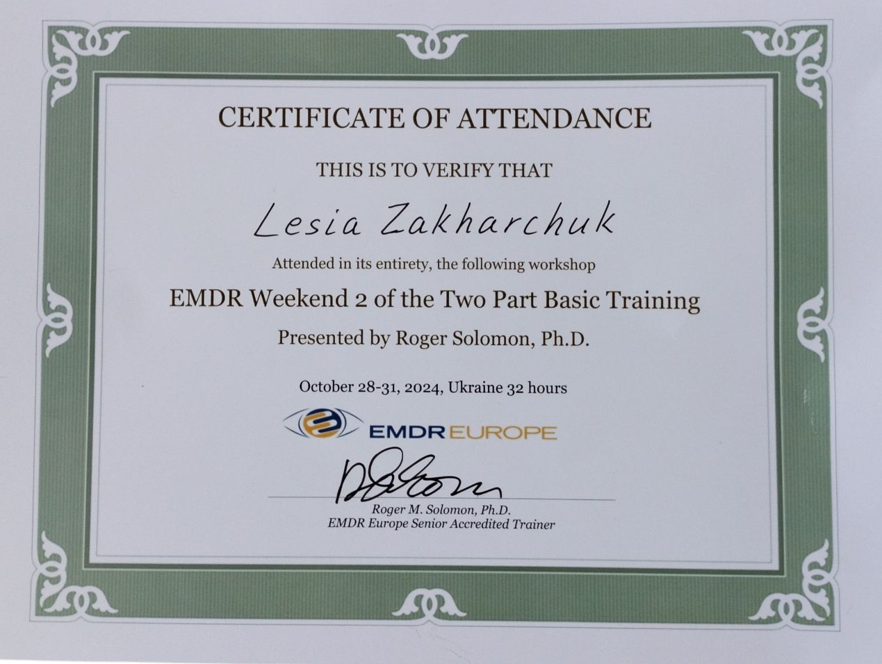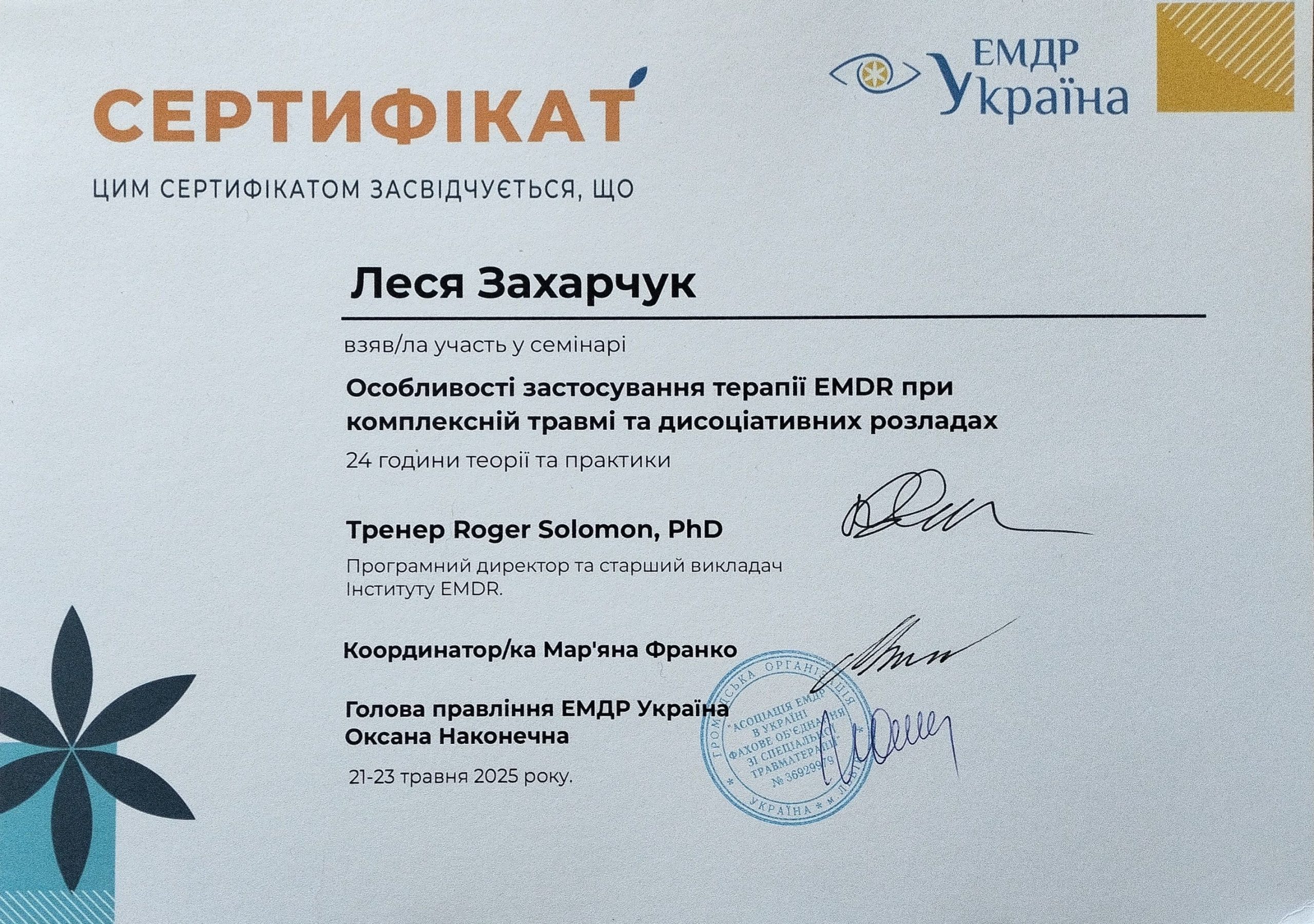 2025 р. – учасник навчального семінару «Лікування ОКР в EMDR»;