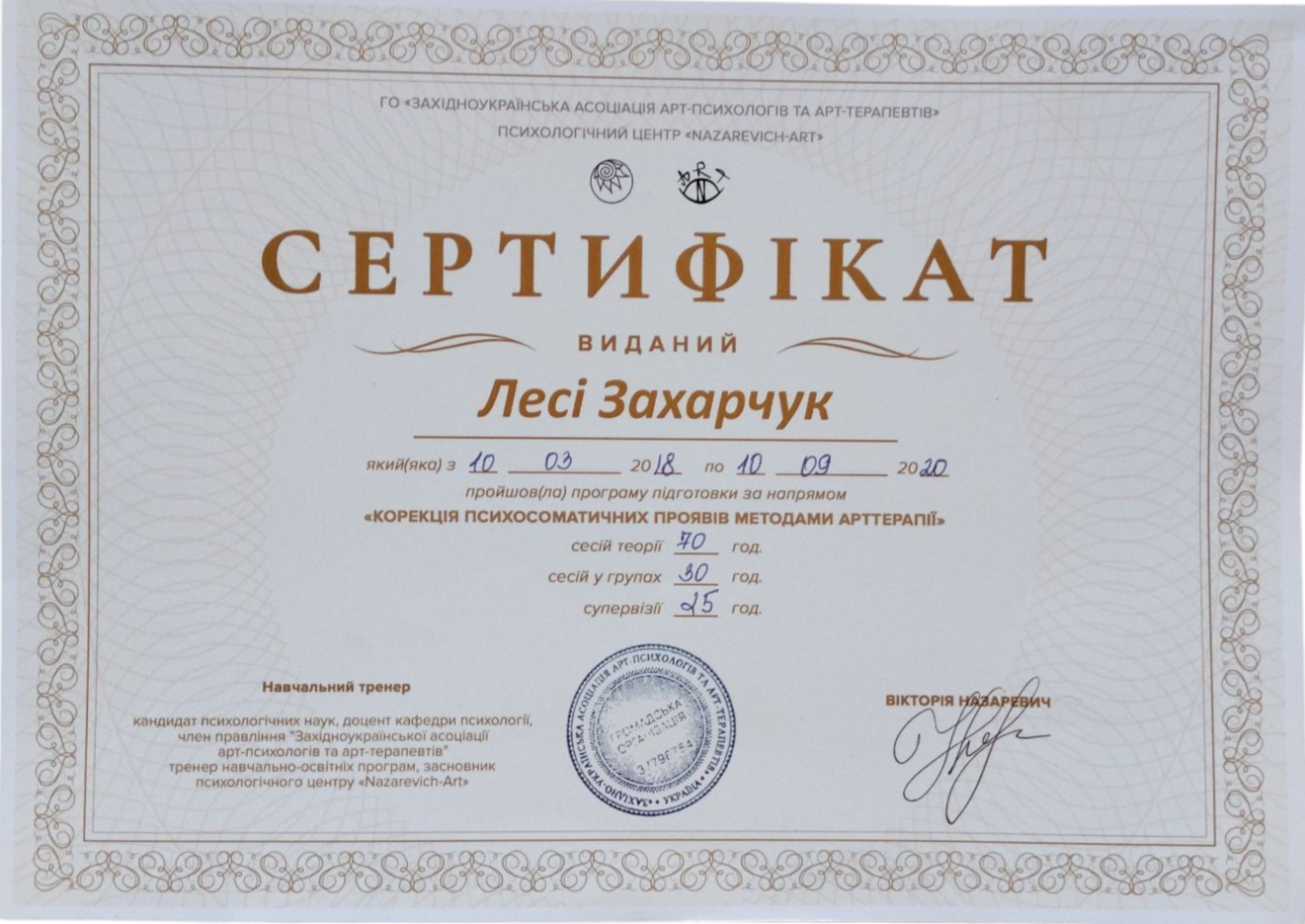 2018-2020рр. – Вивчала корекцію психосоматичних розладів методами арт-терапії у«Назаревич-АРТ»;