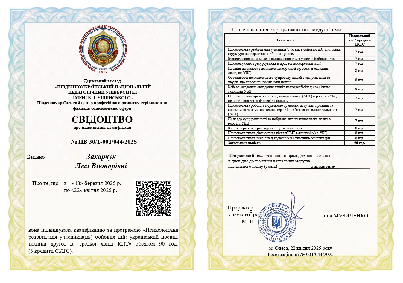 2025р.- Південноукраїнський Національний Педагогічний Університет імені К.Д. Ушинського. Підвищення кваліфікації за програмою «Психологічна реабілітація учасників(ць) бойових дій, український досвід. Техніки другої та третьої хвилі КПТ».