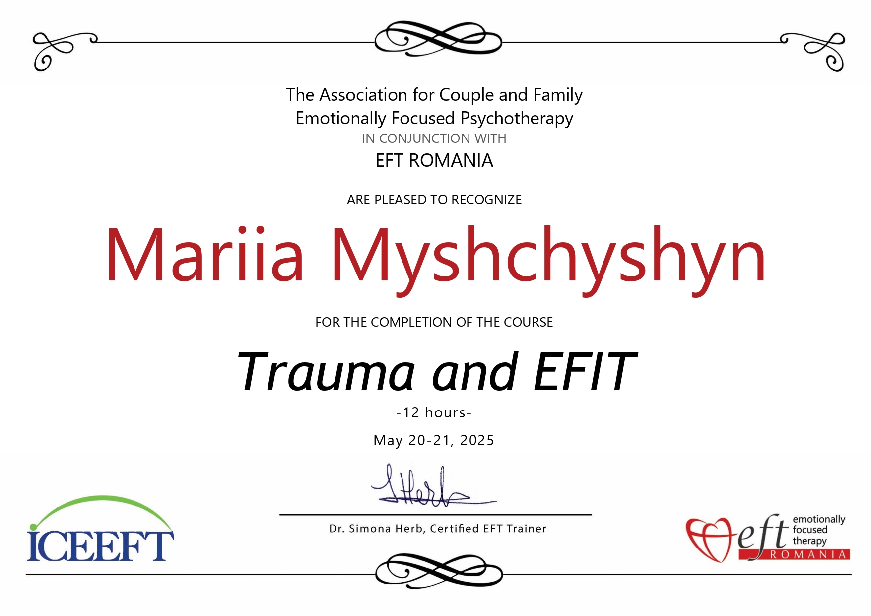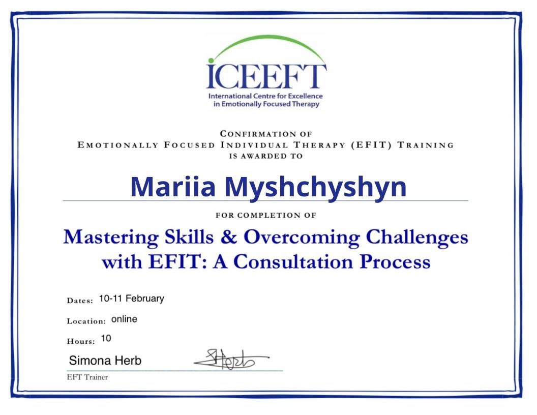 2024-2025 рр. – навчання з Емоційно фокусованої індивідуальної терапії, International Centre for Excellence in Emotional Focused Therapy (ICEEFT);
