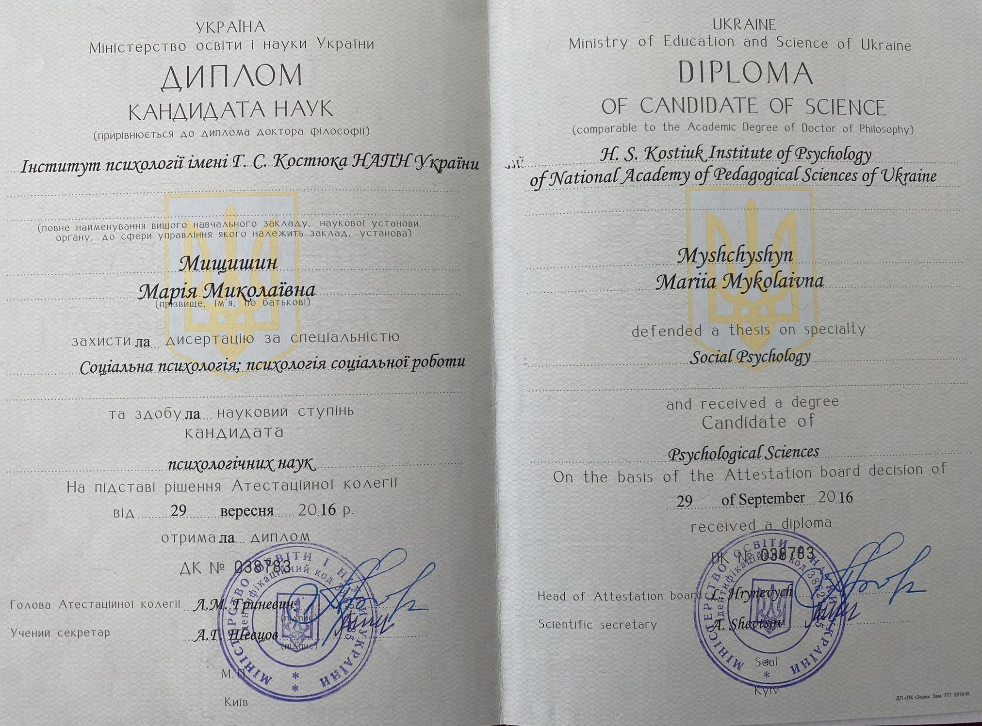 2016 р. – здобуття наукового ступеня кандидата психологічних наук;