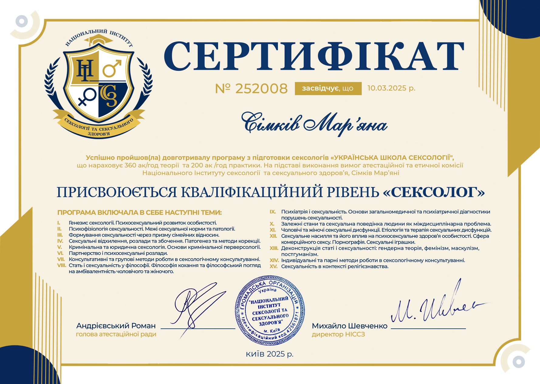 2025р. – здобула кваліфікаційний рівень “Сексолог”.